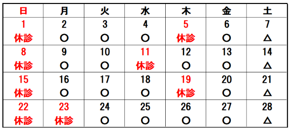 2月カレンダー 〇:午前9:00~12:00・午後15:00~17:30 △:午前9:00~12:00・午後14:00~17:00 ワクチン接種でご来院の方は、アレルギー反応が出る場合がありますので、午前中の接種をお勧めします