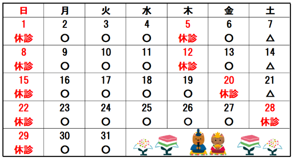 3月カレンダー 〇:午前9:00~12:00・午後15:00~17:30 △:午前9:00~12:00・午後14:00~17:00 ワクチン接種でご来院の方は、アレルギー反応が出る場合がありますので、午前中の接種をお勧めします