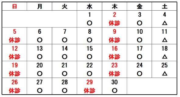 4月カレンダー 〇:午前9:00~12:00・午後15:00~17:30 △:午前9:00~12:00・午後14:00~17:00 ワクチン接種でご来院の方は、アレルギー反応が出る場合がありますので、午前中の接種をお勧めします